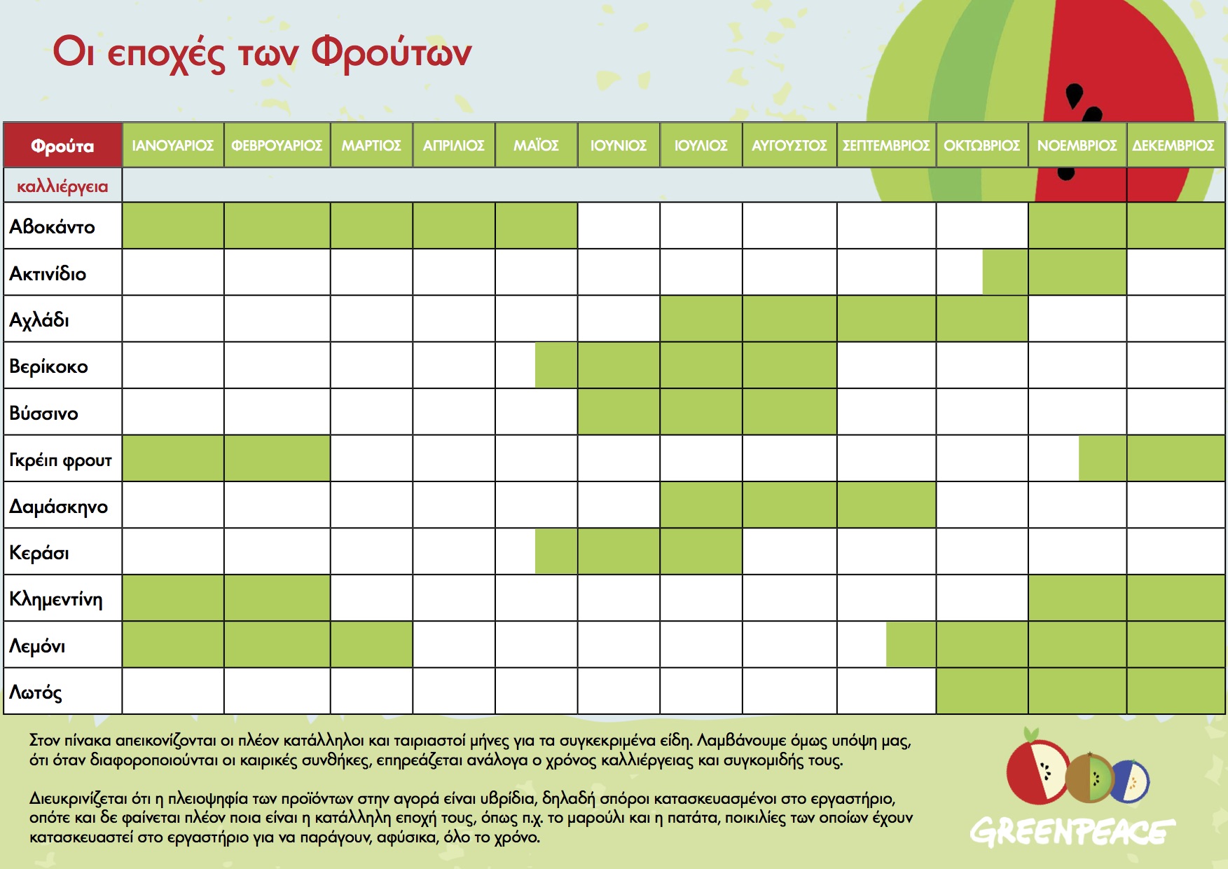Στον πίνακα εποχικότητας φρούτων και λαχανικών της Greenpeace απεικονίζονται οι πλέον κατάλληλοι και ταιριαστοί μήνες για τα συγκεκριμένα είδη. Λαμβάνουμε όμως υπόψη μας, ότι όταν διαφοροποιούνται οι καιρικές συνθήκες, επηρεάζεται ανάλογα ο χρόνος καλλιέργειας και συγκομιδής τους.